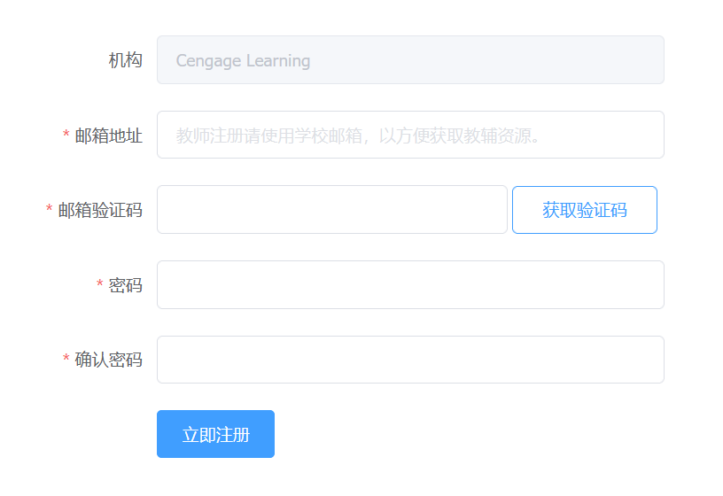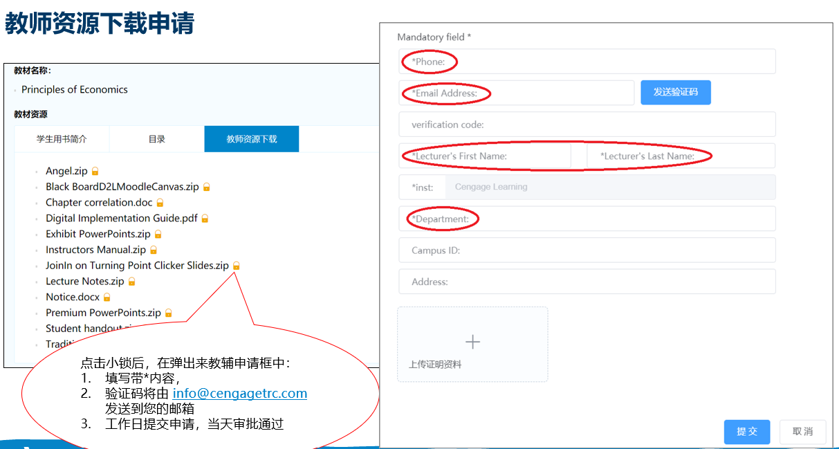 登录后点击课程资源页面下方的锁形图标,进入教师验证界面,填写带星号的信息后,Cengage后台会在一个工作日内进行教师身份验证,验证通过后,用户会收到邮件提醒,重新登录页面即可下载配套资料。
