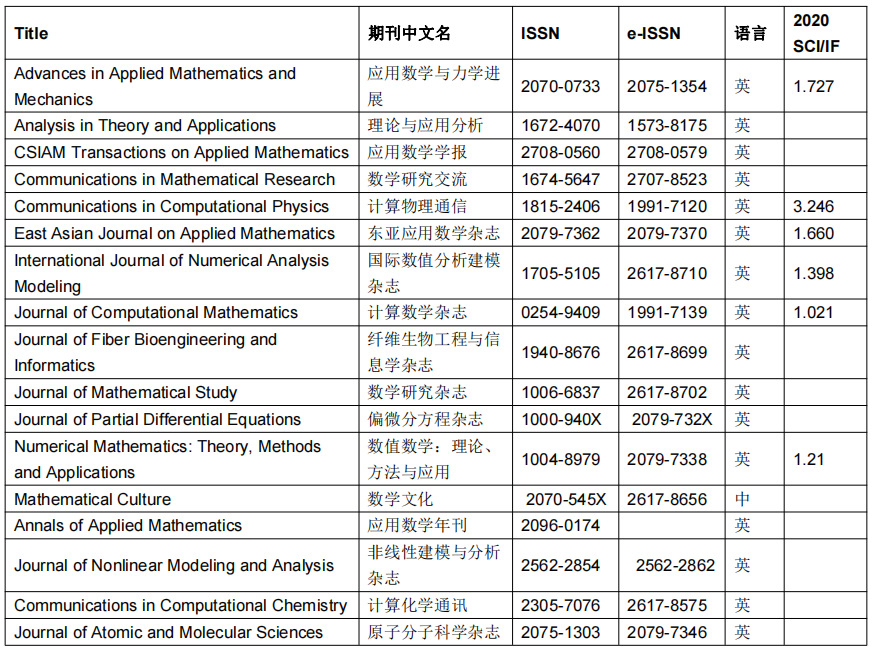 GSP出版数学物理领域的优秀期刊,共有16种英文期刊和一种中文期刊(其中6本SCI,2本ESCI 期刊),涵盖了整个数学领域,既有基础理论研究,也有应用研究。4本SCI 期刊曾经在2015-2017年与剑桥大学出版社合作。