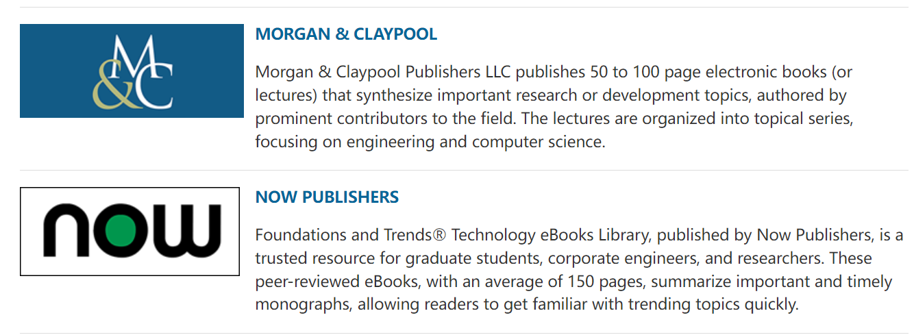 Now Publishers Foundations and Trends® Technology eBooks Library(简称FnT):提供550多本最新热点技术(侧重工程,能源和计算机领域)的综述专题。每本综述书籍约150页左右,均由各领域顶尖专家组稿及撰写,提供在 Scopus SCImago SJR 排名前十的高质量文献。该综述书籍可视为传统综述文献(Review Paper)的升级版,提供教科书及技术课程以外更深入内容与分析,为相关领域的从业者提供全面的新技术概览,对科研教学以及产品研发极具价值。
