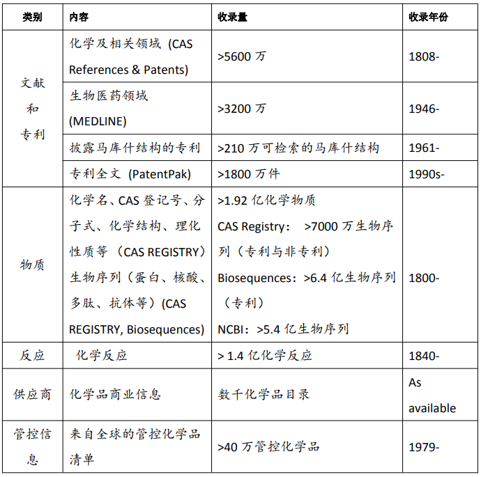 CAS SciFindern中可检索的信息 (截止2021年12月): 可以获得、检索以下数据库信息: CAS References & CAS Patents (文献数据库)、CAS REGISTRY® (物质信息数据库)、CAS Reactions (化学反应数据库)、CAS Markush(马库什结构专利信息数据库)、CAS Chemical Compliance Index (管控化学品信息数据库)、CAS Commercial Sources (化学品商业信息数据库)、MEDLINE®(美国国家医学图书馆数据库)。详情参考下表: