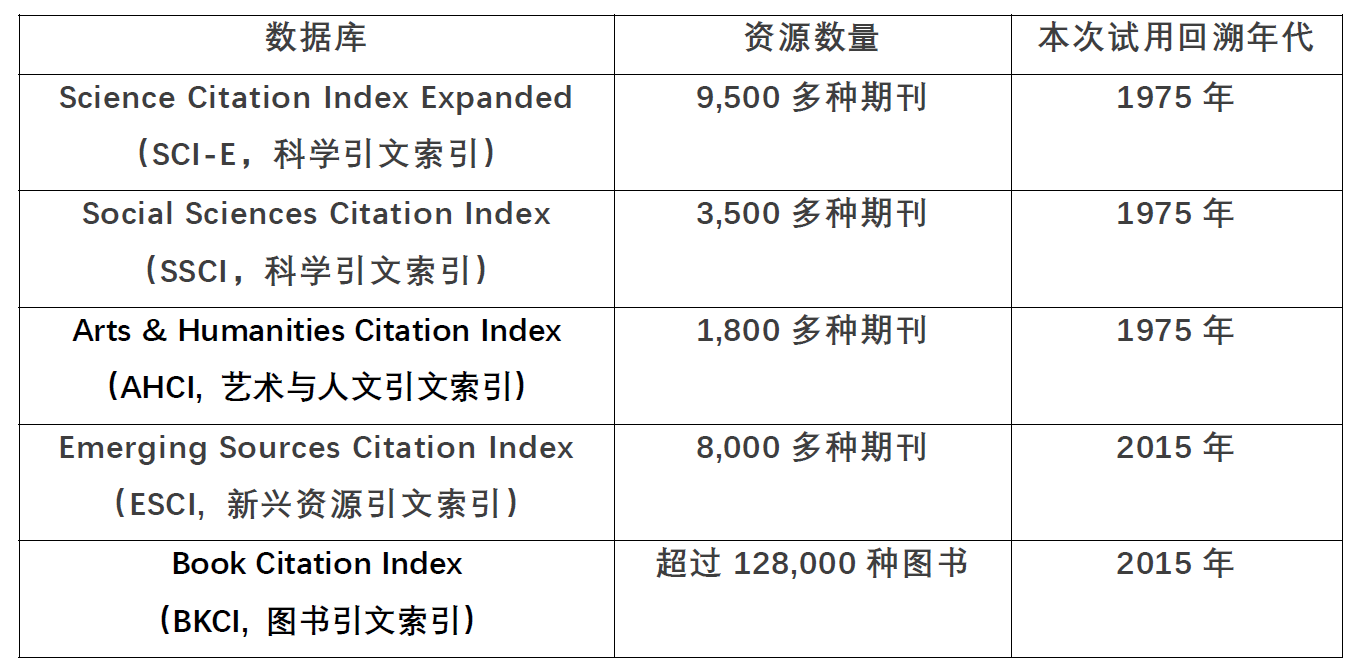 Web of Science核心合集的构成、资源数量及其本次试用回溯深度:
