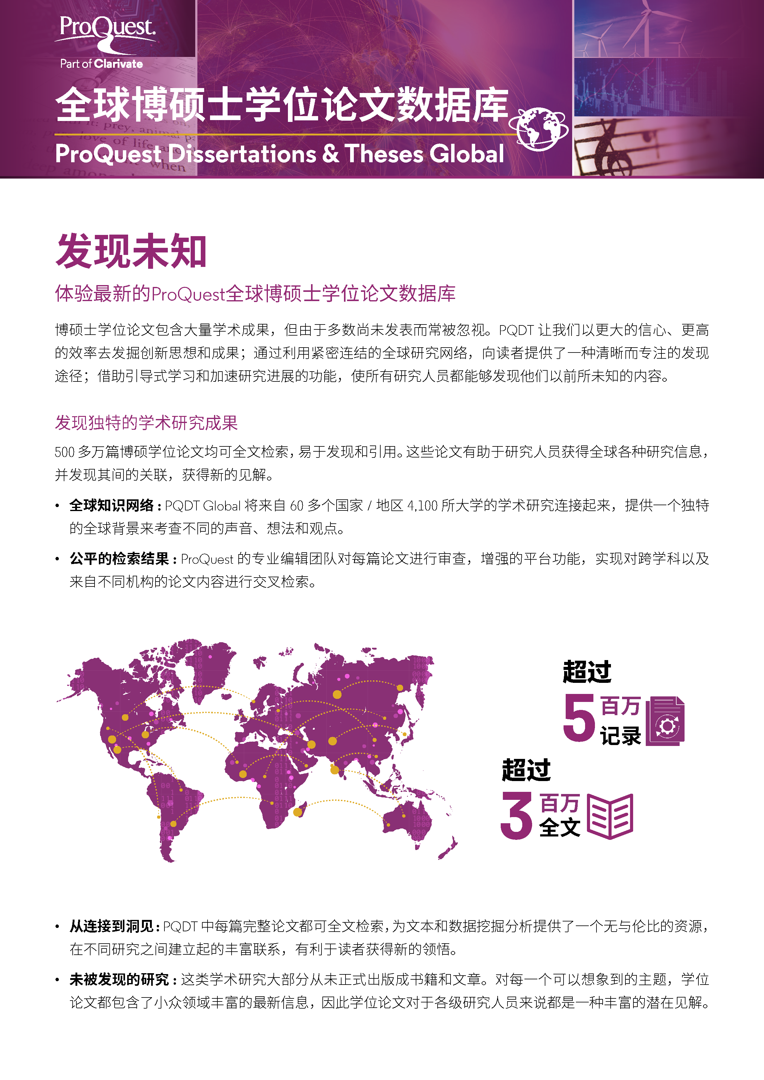 访问网址:https://www.proquest.com/pqdtglobal/databases?accountid=28278 使用方式:用户在机构IP范围内用可正常使用。 资源库简介:ProQuest是美国国会图书馆指定的收藏全美国博硕士论文的机构,PQDT Global是目前世界上规模最大、使用最广泛的博硕士论文数据库。截至目前,收录1743年至今全球超过3000余所高校、科研机构逾556万篇博硕士论文信息,其中,博硕士学位论文全文文献逾312万篇以及556多万篇学位论文文摘索引记录,便于用户集中访问所需论文。涵盖了从1861年获得通过的全世界第一篇博士论文(美国),回溯至十七世纪的欧洲培养单位的博士论文,到本年度本学期获得通过的博硕士论文信息;PQDT Global内容覆盖科学、工程学、经济与管理科学、健康与医学、历史学、人文及社会科学等各个领域。每周更新,年增论文逾20万篇。