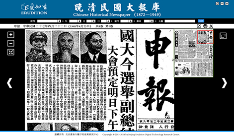 爱如生晚清民国大报库(主题检索版)收录自清同治十一年(1872年)至中华民国三十八年(1949年)七十余年间,存续时间长、影响范围广、史料价值高的大型报纸共计20种,包括上海申报、新闻报、时报、时事新报,天津益世报、大公报、庸报,北京晨报、京报,南京新民报,国民党办民国日报、中央日报、扫荡报,共产党办红色中华新中华报、新华日报、解放日报,民营神州日报、世界日报,以及日系顺天时报、盛京时报等,总约20万个期号。从不同立场、不同视角和不同层次,全面反映十九世纪后半叶、二十世纪前半叶波澜壮阔的中国近代史,忠实保存近百年间中国国家政治和社会生活的珍贵史料,具有重要的学术意义。