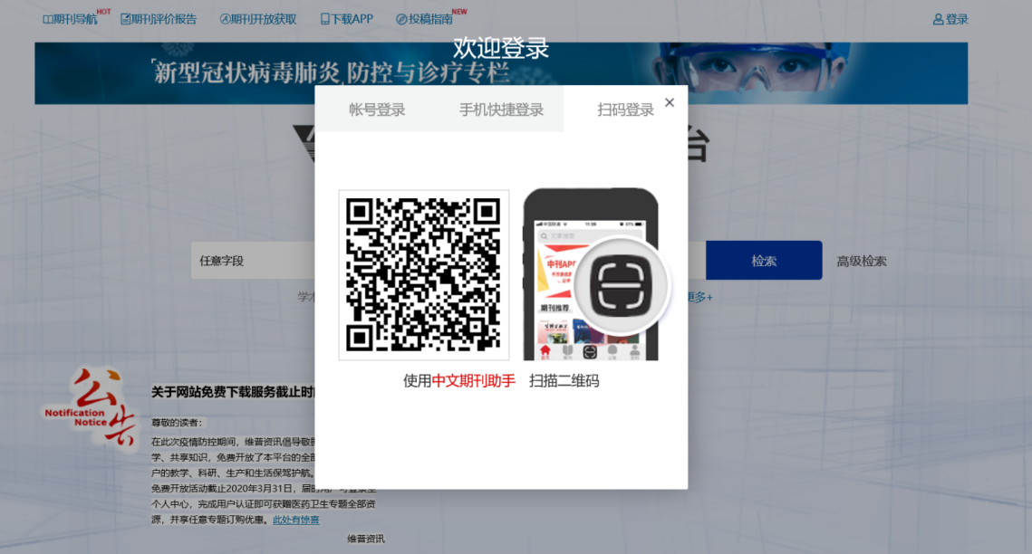 扫描电脑端《中文期刊服务平台》机构授权二维码(鼠标置于中文期刊服务平台首页的“东北大学”上出现);需电脑端绑定机构。