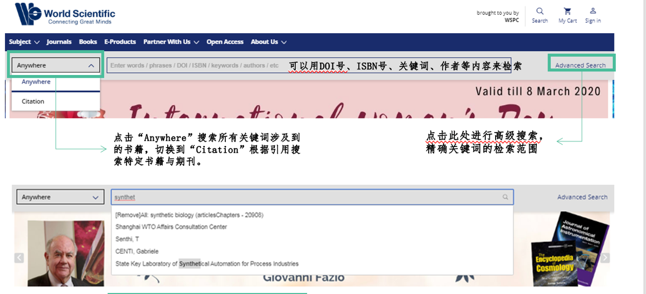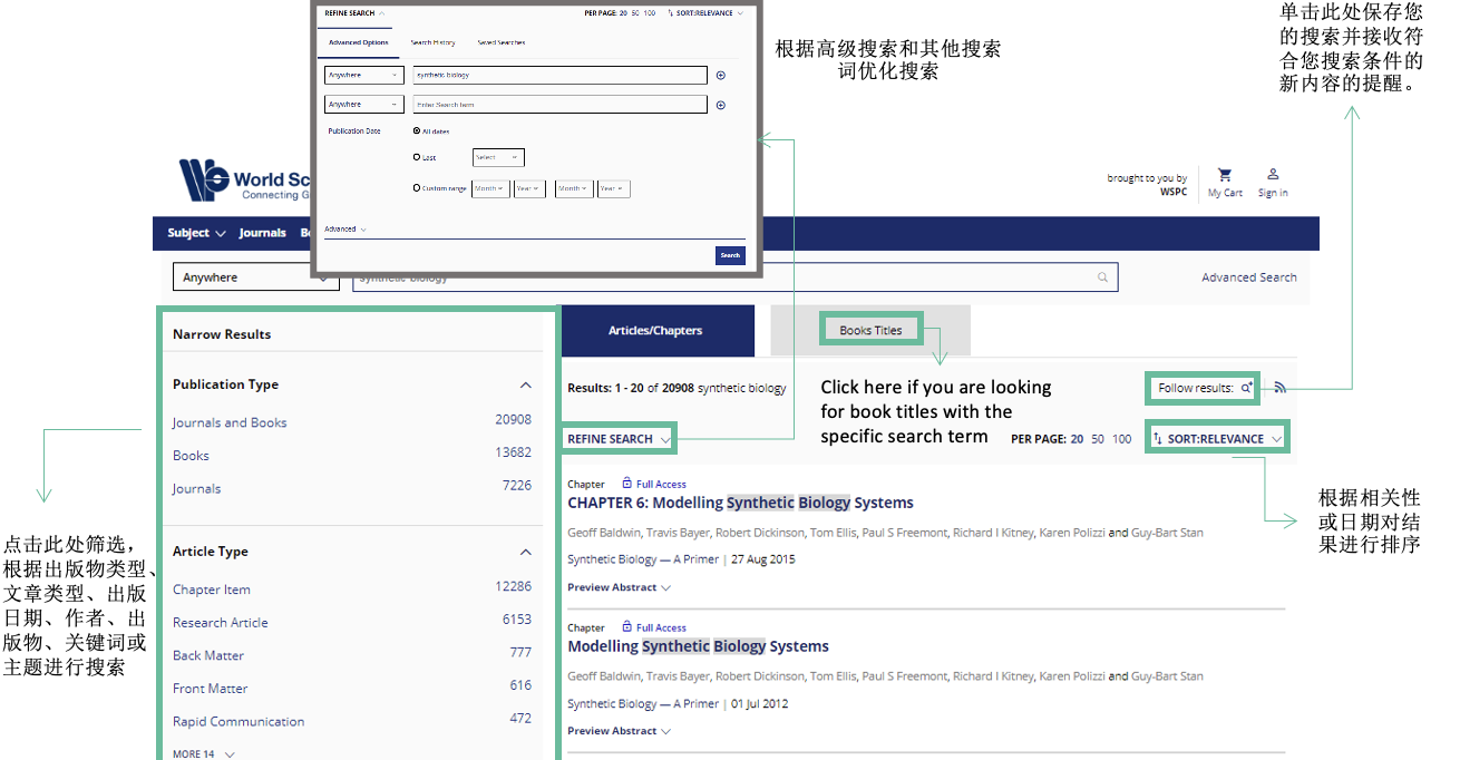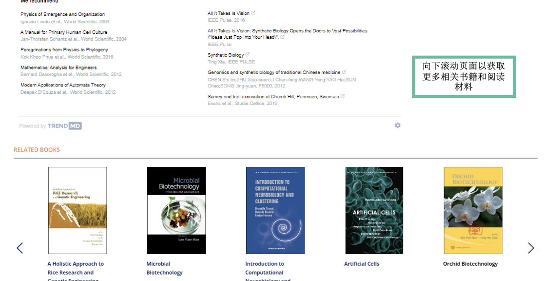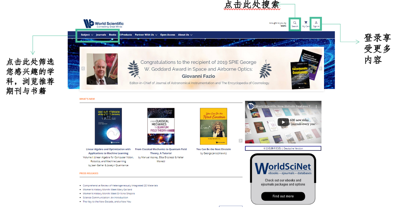 资源简介:世界科技出版公司(World Scientific Publishing)成立于新加坡,是当今亚太地区规模最大的英文科技出版公司,也是世界主要科技出版公司之一。专职出版高科技书刊,拥有阵容强大的作者群,包括包括许多诺贝尔奖获得者、沃尔夫奖、菲尔兹奖得主及各领域顶尖学者。1991年,世界科技获得瑞典诺贝尔基金会(Noble Foundation)的授权,在全球独家出版发行自1901年以来诺贝尔奖得主的生平及演讲文集,并成为多位诺贝尔奖得主著作的主要出版机构。 出版学科简介:数学及非线性科学、物理及天文学、化学及材料科学、计算机科学、工程技术、环境工程、医学、生命科学、商业与管理、经济与金融、社会科学及亚洲研究。 访问链接: https://www.worldscientific.com 试用期限:2024年11月21日——2025年1月20日 注意事项: 1.电子书试用期间暂时仅支持“在线阅读”,无法下载。 2.另外,有些电子书界面有红色标识提醒有“Usage restrictions”,则表示该为电子教材,不在本次开放试用的范围内,有使用限制,请注意。 World Scientific数据库使用指南: 1.点击网址:https://worldscientific.com/。或在浏览器中搜索World Scientific,进入官网。官网页面: