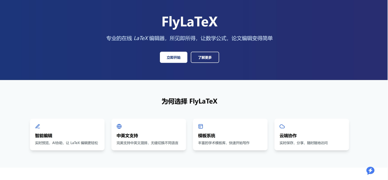 1)如何开始使用FlyLaTeX?访问FlyLaTeX主页:https://www.flylatex.cn