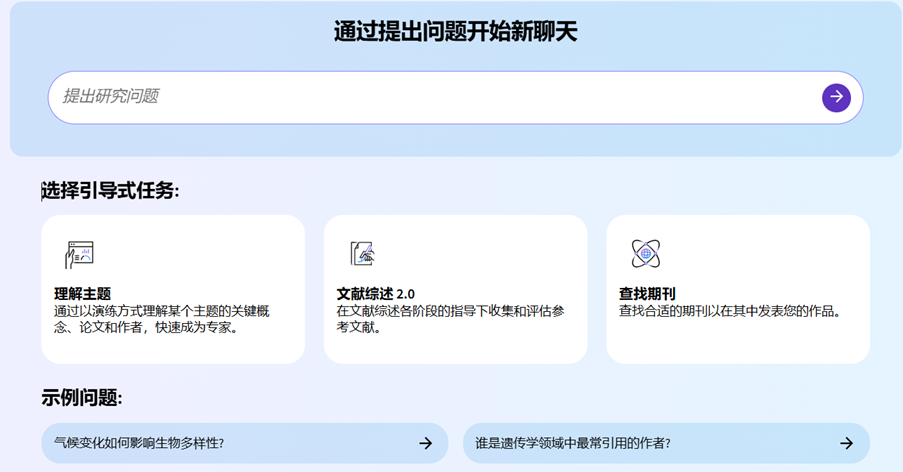 带有引导的提示(prompt)和任务——该工具会在用户检索时提供建议,引导用户结合上下文情境改进提示,扩大或进一步精炼需要涵盖的研究领域。引导任务可以帮助研究人员“理解主题”、获取“文献综述 ”或“查找期刊”,准确获取所需要的内容。