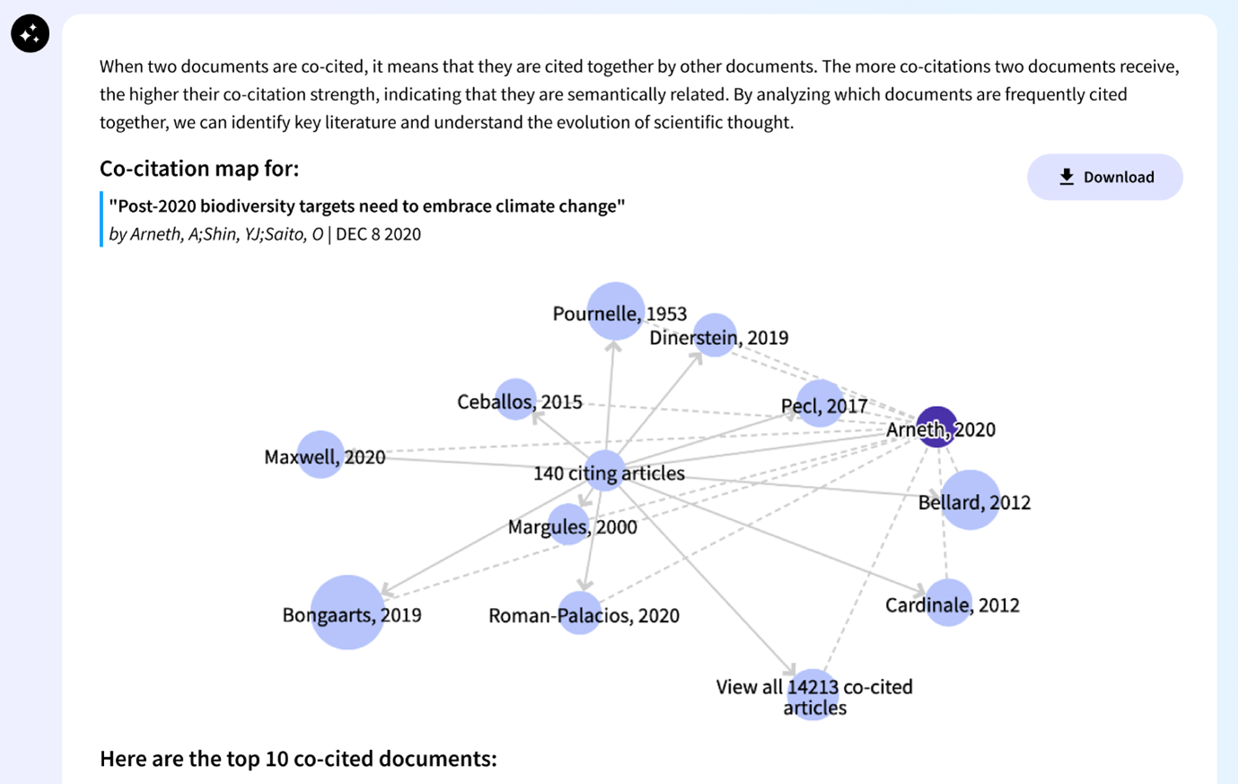 Web of Science AI 研究助手能帮助研究人员更快地找到关键论文,处理复杂的研究任务,将各种关联可视化。聊天界面结合 Web of Science 知识图谱与研究人员进行互动,将帮助研究人员从 Web of Science 核心合集超过120年的可信论文及引文数据中更多发现。