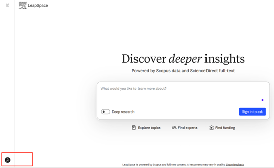 第三步:访问LeapSpace主页(https://www.sciencedirect.com/leapspace),点击左下角登录个人Elsevier账号。首次登录后,请关闭并重启浏览器,再次访问LeapSpace主页,后续即可正常使用。*