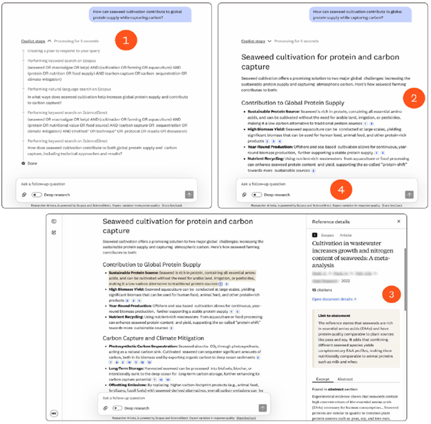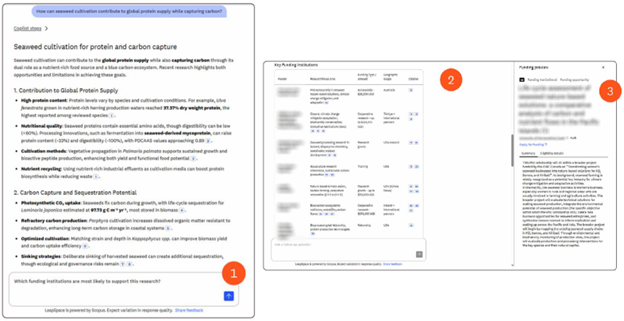 3) 利用参考文献“深入研究”:LeapSpace 的每一个回答都建立在经过同行评审、严格筛选的内容之上——既广泛依托于爱思唯尔旗下出版商中立的Scopus数据库 ,也深度汲取了来自爱思唯尔及其他出版商的全文研究成果。参考文献功能让您可以追溯任一论述背后的原始资料 ,点击任一文献即可展开信息面板 ,其中不仅包含完整的书目信息 ,还包含被称为“信任卡 ”的“关联段落 ”——清晰展示该论述与引用来源的吻合程度。这一透明机制让您在探索复杂研究时 ,既能增加可信度 ,更能助您直抵信息出处 ,节省宝贵时间。